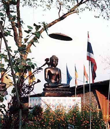 『三帰依文』が小さなお堂に響き渡りました。折しもちょうど二月十五日、お釈迦さま涅槃の日です。インドやチベット・タイ・ミャンマー(ビルマ)・韓国、そして日本。各国の仏教徒が途切れることなくお参りにくるその中で、お釈迦さまのお顔は、お堂の入り口から射し込む夕日にますます金色に輝き、永遠の微笑みを浮かべられていました。