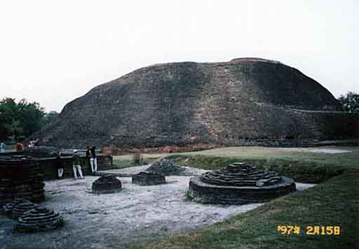 こんもりとした丘は、お釈迦さまが火葬にされたところを表しています。お供えされていたお花とローソクが、お参りが絶えないことを示していました。 “生と死”は決して分けては考えられません。表裏一体。そればかりか死が生を支えていました。死あっての生であり、生あっての死でした。真っ赤に燃え上がってインドの大地に落ちていく太陽は、何億年という途方もない時を刻み続けてきました。人間の一生は長くてもせいぜい百年ちょっと。宇宙の時間の中では瞬きほどの時間です。しかし一瞬でも、確実に光り輝いている存在でした。あの太陽のように。しかし自らが光り輝く存在だということに気がつく人は稀です。世間の価値観に縛られ、埋もれもがいているのが落ちでした。お釈迦さまのみ教えは、そんな私をあの太陽のように照らし続けて下さいます。