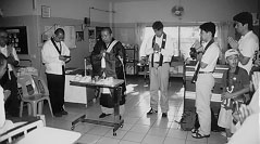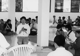 この寺はエイズの治療はしません。死を目前にした人が、安らかに充実した時を過ごすための安息地なのです。ここで働く人たちがみせる受容のまなざしは、確かに死の恐怖を克服させる力を湛えているようです。 今回訪れた私たちが日本の仏教僧侶ということを知ると、ぜひ皆のために法要をしてほしいという要望があり、病棟で読経をしました。数日後には必ず亡くなるであろう方が合掌して私たちの読経に聞き入る姿に接しながら、この寺の住職のアロンコット師が言う、患者や感染者の意思や精神を尊重することによる人間性回復の中に仏教の本来的役割を見る、ということを日本で実現する方途を考えざるをえませんでした。 | ||||