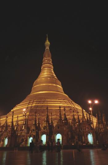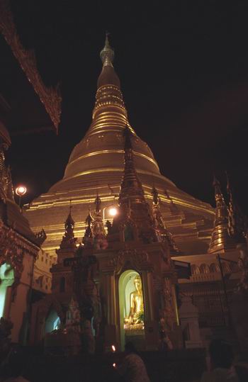 この国で一番有名なパゴダといえば、何といっても首都ヤンゴンにある『シュエダゴンパゴダ』です。高さは何と100mもあり、総金箔張り。 塔の上部には宝石が散りばめてあるそうです。その大きさが醸し出す荘厳さに圧倒され、不思議と心が安らぎます。 日本の小さい仏像やお寺の感覚が染みついている私は、一見しただけで安らぎの心になった自分に驚きつつ、思わず「大きいことは良いことだ」と感心しました。 このパゴダは、今を遡ること2500年前、インドに旅したこの国の商人が建てた そうです。 彼はお釈迦さまに直接お会いし、髪の毛を分けてもらいました。大事にそれ を国まで持ち帰り、仏塔を建てそこに納めたそうです。やがて時の権力者達がその仏 塔の上に増築し、現在の姿になったということです。