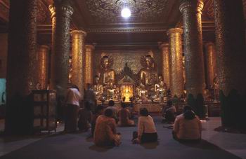 私は夜の8時頃に訪れました。素足で大理石が敷き詰められた床を歩くと、非常に心地よく、心身共に穏やかになります。 日中の38℃という暑さも一息つき、宵の爽やかな風に誘われて、広大な敷地の中には驚くほどたくさんの老若男女がおりました。 床に座り込んでお参りをしたり、恋人と会話をしたり、子供たちは走り回ったり。目の前にはライトアップした巨大な金泊張りのパゴダ。さながらお釈迦さまに見守られているかのようです。まさに生きた信仰の姿がそこにありました。