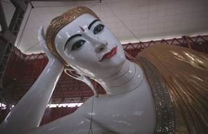 首都ヤンゴンには、バゴーの寝釈迦仏と同じくらい大きな寝釈迦仏があります。 ![]() 幹線道路から一本脇道へ入ります。そこにチャチャウッタヂー寺院は佇んでいました。シェイダゴンパゴダの絢爛豪華なたたずまいを知った後に訪れますと、ものすごく質素に見えます。果たして「こんな所に巨大寝釈迦仏が?」。 しかし、一歩境内へ入りますと、唖然呆然。柱の間からかいま見えるそのお姿は、信じられないぐらいにで・か・い。何と全長70m、高さ17m。鉄骨の屋根で覆われています。 ![]() 人間って、あんまりにも大きなモノを見ると、笑ってしまうのですよね。その雄大さに飲まれてしまというのか、呆れるからなのか。私はしばらく笑いが止まりませんでした。 この国は巨大な仏さまが大好き。私も大好きです。