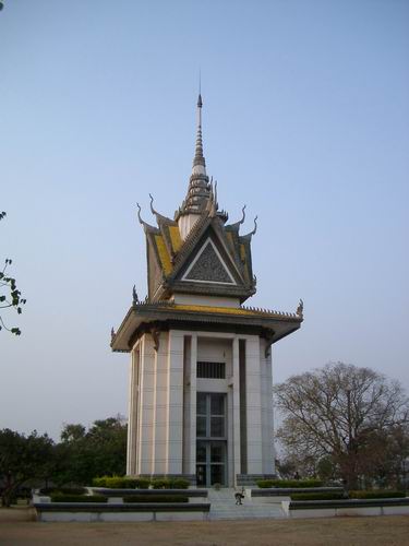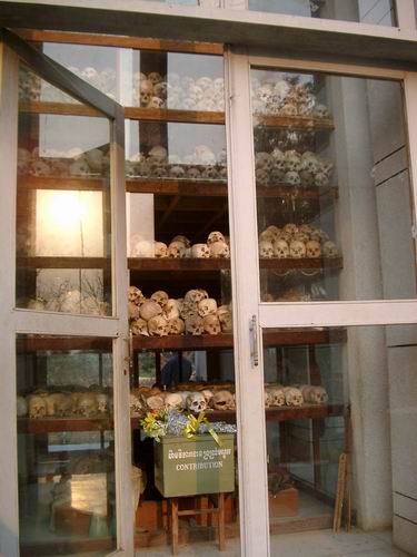 | この記念塔には、埋葬されていた多数の遺骨が安置してあります。大量の頭蓋骨。勿論一つ一つがこの世に生きていた一人の人間です。それぞれが愛する人を持ち、必要とされ、掛け替えのない自らのドラマを持っていた人々。何の因果かその時代のカンボジアに生まれてしまい、何の因果かポル・ポト派によって人民の敵とされ、容赦なく殺され、ゴミのように埋められた人々。この悲しみをどうすればいいのでしょうか。 |