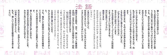 私達、神青会(東京教区神奈川組青年僧侶会)では、通夜・葬儀に参拝する親族・会葬者を対象に「葬儀のしおり」(リーフレット)を作成しています。添付のしおりは、今年(1999年)作成した3刷目のものです。 しおりは葉書サイズで会葬礼状にはさみお配りしていただくものです。できれば清め塩のパックと差し替えてもらえればと思っています。 葬儀をたんなる告別式として終わらせるのではなく、悲しいご縁を通して、自らのいのちの学びをさせていただければとの思いで配布させていただいております。 内容は、法話と葬儀にまつわる習俗についての提言を載せています。短い文章ですので、お焼香や出棺の待ち時間に読んでもらえればと思っています。みなさまと共に葬儀のあり方を考えていただければ幸いです。 私たちの活動の一つを紹介させていただきました。 | ||