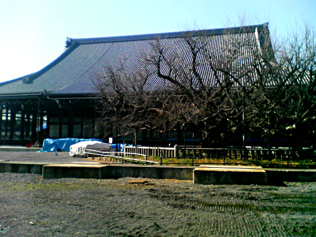 京都駅よりカラカラとスーツケースを引きずりながら細い新町通りからご本山に向かいました。そして、左に曲がって西洞院通りを渡り伝道院の前を通り過ぎたあたりで御影堂の姿に気付いたのであります。 そういえば御影堂の屋根が見えるようになったのだったな、と考えながら堀川通りについたとき、数年ぶりに見るその大きな屋根に圧倒されました。