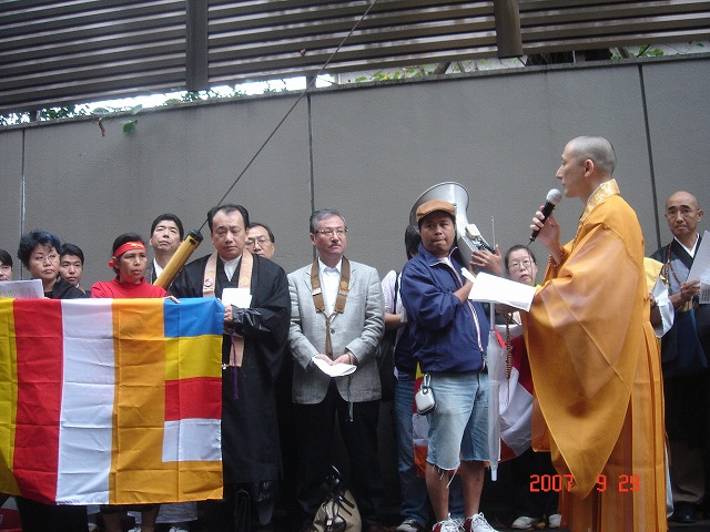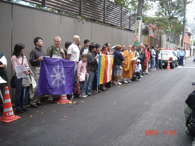 2007年9月29日(土)午後3時、北品川の住宅街にあるミャンマー(ビルマ)大使館前にて、ビルマ国内における平和的デモに対する軍部の武力行為を憂い、平和を願う集いが、宗派を超えた仏教者の連帯により自主的に開催されました。