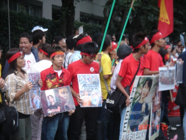 小雨の降る中、大変多くのビルマの人びと(数百人の大人の男女、そして、若い人や子ども)が大使館前に集まり、手にはプラカードや、武力でデモで殺された人びとの写真などを掲げて、それぞれに思いを訴えていました。