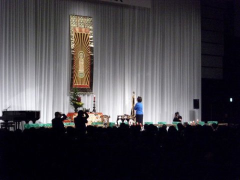 第一部の記念大会では、重誓偈作法の音楽法要の後、宗教評論家のひろさちや氏の記念講演がありました。 ひろ氏独特のユーモアを交えつつ、大会テーマ 「ともに生きる いのち見つめて」にそって阿弥陀さまのいのちを見る眼差しにふれ、いのちを私物化するのではなく、自分のいのちも他のいのちも阿弥陀さまからの預かりものであると思って生きてくださいとお話されました。