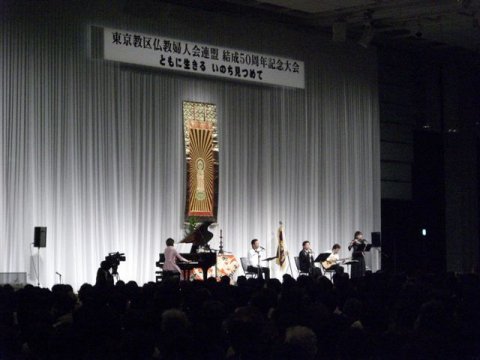 続いて、教区仏教婦人会連盟の50周年の歩みについて映像を交えて振り返った後、法話楽団・迦陵頻伽の記念法話もありました。 「悲しみの向こうで あなたに遇える」を講題に、「ふるさと」や「しゃぼん玉」などの童謡を参加者と一緒に歌いつつ、心にしみるご法話を聴聞させていただきました。