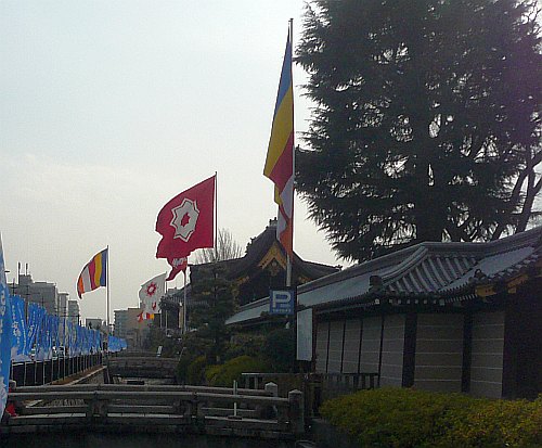 この旗は「八角菊くずし紋」といいます。本願寺の「下がり藤」の紋と同様、この「菊くずし」の紋も本願寺の紋章の一つで、天皇家の「菊花紋」がもとになっているものです。京都の本願寺のご正忌報恩講(毎年1月9〜16日勤修)の時に、仏旗とともにこの「菊くずし」をあしらった大きな旗が山門に掲げられます。白地に赤の紋と赤地に白の紋の二種類があります。